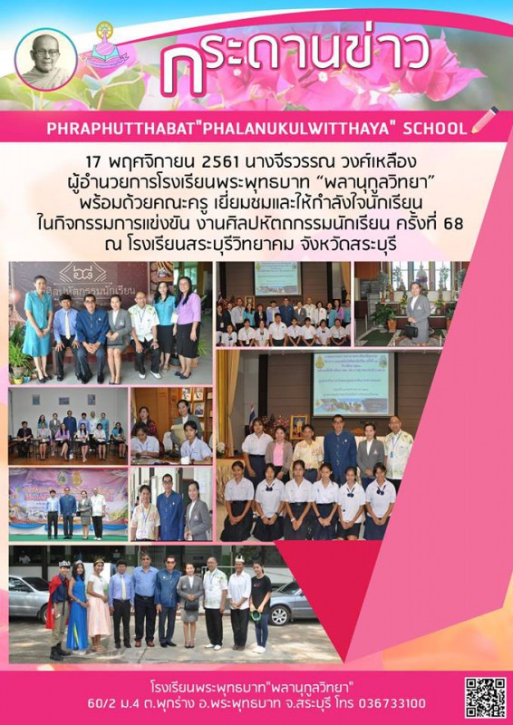 17 พฤศจิกายน 2561 นางจีรวรรณ วงศ์เหลือง ผู้อำนวยการโรงเรียนพระพุทธบาท “พลานุกูลวิทยา” พร้อมด้วยคณะครู เยี่ยมชมและให้กำลังใจนักเรียนในกิจกรรมการแข่งขันงานศิลปหัตถกรรมนักเรียน ครั้งที่ 68 ณ โรงเรียนสระบุรีวิทยาคม จังหวัดสระบุรี