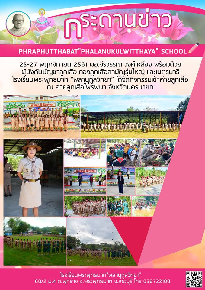 25-27 พฤศจิกายน 2561 ผอ.จีรวรรณ วงศ์เหลือง พร้อมด้วย ผู้บังคับบัญชาลูกเสือ กองลูกเสือสามัญรุ่นใหญ่ และเนตรนารี โรงเรียนพระพุทธบาท “พลานุกูลวิทยา” ได้จัดกิจกรรมเข้าค่ายลูกเสือ ณ ค่ายลูกเสือไพรพนา จังหวัดนครนายก