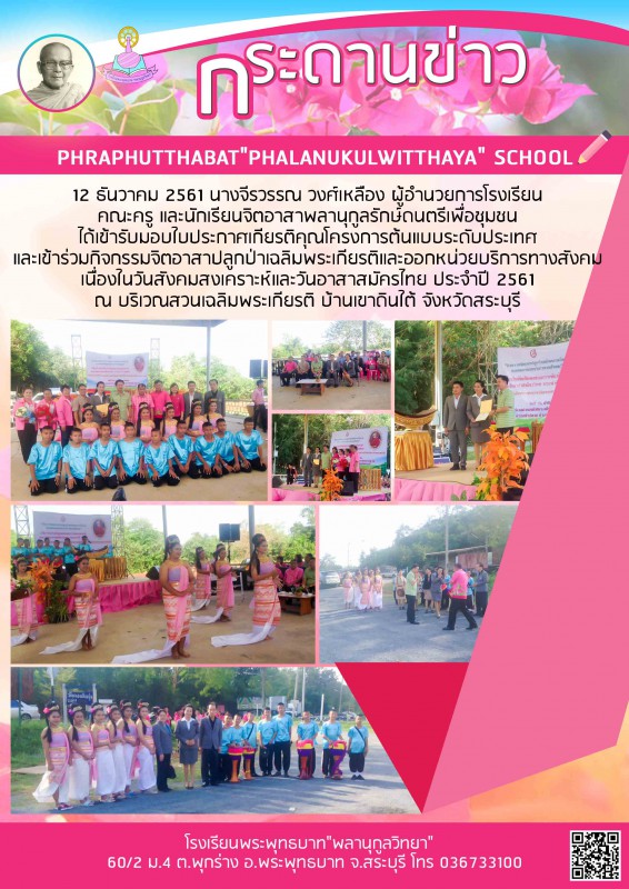 12 ธันวาคม 2561 นางจีรวรรณ วงศ์เหลือง ผู้อำนวยการโรงเรียน คณะครู และนักเรียนจิตอาสาพลานุกูลรักษ์ดนตรีเพื่อชุมชน ได้เข้ารับมอบใบประกาศเกียรติคุณโครงการต้นแบบระดับประเทศ และเข้าร่วมกิจกรรมจิตอาสาปลูกป่าเฉลิมพระเกียรติและออกหน่วยบริการทางสังคม เนื่องในวันสัง