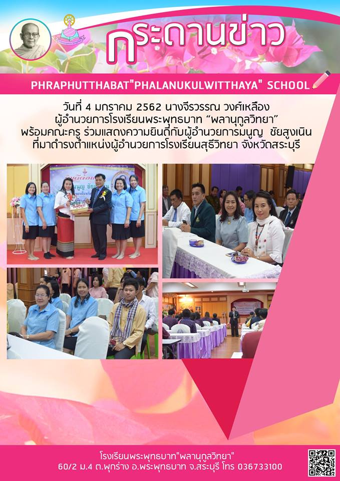 4 มกราคม 2562 นางจีรวรรณ วงศ์เหลือง พร้อมคณะครูโรงเรียนพระพุทธบาท "พลานุกูลวิทยา" ร่วมแสดงความยินดีต้อนรับท่านผู้อำนวยการมนูญ ชัยสูงเนิน ที่มาดำรงตำแหน่งผู้อำนวยการโรงเรียนสุธีวิทยา จังหวัด สระบุรี