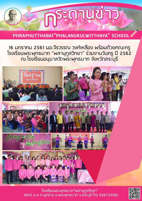16 มกราคม 2561 ผอ.จีรวรรณ วงศ์เหลือง พร้อมด้วยคณะครู โรงเรียนพระพุทธบาท “พลานุกูลวิทยา” ร่วมงานวันครู ปี2562 ณ โรงเรียนอนุบาลวัดพระพุทธบาท จังหวัดสระบุรี