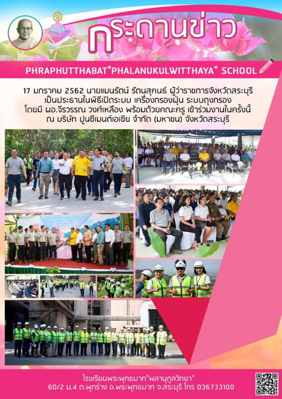 17 มกราคม 2562 นายแมนรัตน์ รัตนสุคนธ์ ผู้ว่าราชการจังหวัดสระบุรี เป็นประธานในพิธีเปิดระบบ เครื่องกรองฝุ่น ระบบถุงกรอง โดยมี ผอ.จีรวรรณ วงศ์เหลือง พร้อมด้วยคณะครู เข้าร่วมงานในครั้งนี้ ณ บริษัท ปูนซีเมนต์เอเซีย จำกัด (มหาชน) หมู่ที่ 1 ตำบลพุกร่าง อำเภอพระพ