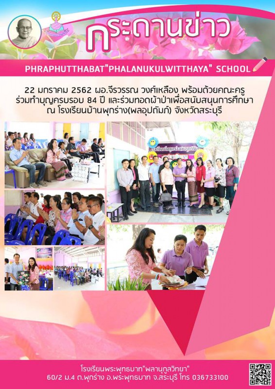 22 มกราคม 2562 ผอ.จีรวรรณ วงศ์เหลือง พร้อมด้วยคณะครู ร่วมทำบุญครบรอบ 84 ปี และร่วมทอดผ้าป่าเพื่อสนับสนุนการศึกษา ณ โรงเรียนบ้านพุกร่าง(พลอุปถัมภ์) ตำบลพุกร่าง อำเภอพระพุทธบาท จังหวัดสระบุรี