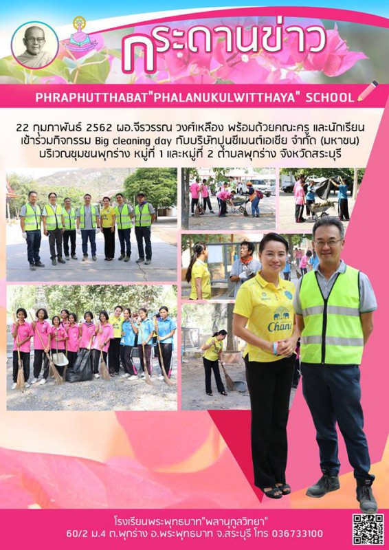 22 กุมภาพันธ์ 2562 ผอ.จีรวรรณ วงศ์เหลือง พร้อมด้วยคณะครธและนักเรียนเข้าร่วมกิจกรรม Big Cleaning day