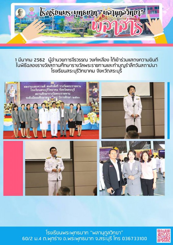 1 มีนาคม 2562 ผอ.จีรวรรณ วงศ์เหลือง ได้เข้าร่วมแสดงความยินดีในพิธีฉลองรางวัลสถานศึกาารางวัลพระราชทานและทำบุญรำลึกวันสถาปนา โรงเรียนสระบุรีวิทยาคม จังหวัดสระบุรี