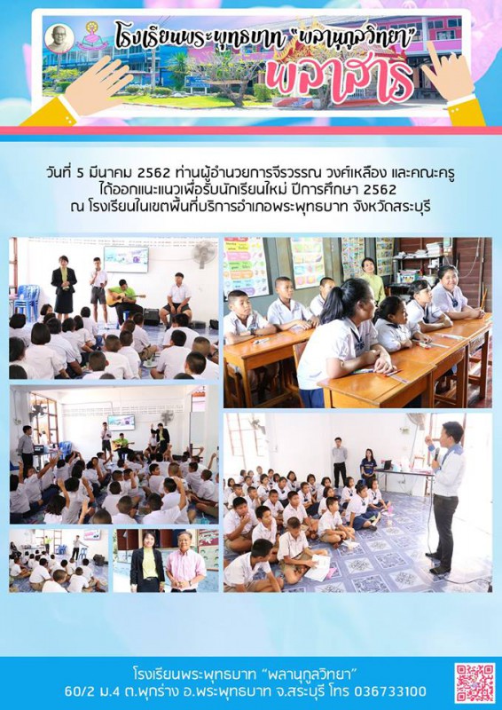 5 มีนาคม 2562 ผอ.จีรวรรณ วงศ์เหลือง และคณะครูได้ออกแนะแนวเพื่อรับนักเรียนใหม่ ปีการศึกษา 2562 ณ ดรงเรียนในเขตพื้นที่บริการอำเภอพระพุทธบาท จังหวัดสระบุรี