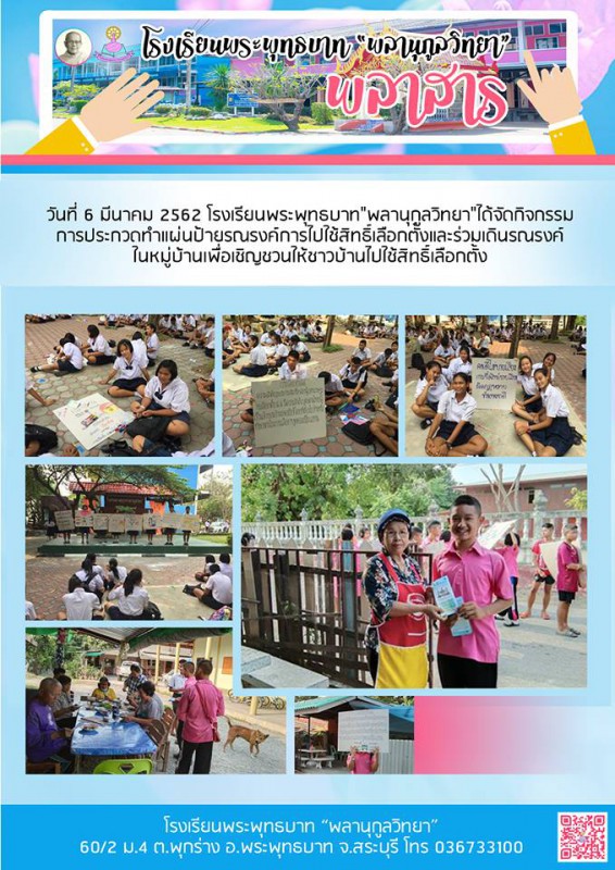 6 มีนาคม 2562 โรงเรียนพระพุทธบาท "พลานุกูลวิทยา" ได้จัดกิจกรรมการประกวดทำแผ่นป้ายรณรงค์การไปใช้สิทธิ์เลือกตั้งและร่วมเดินรณรงค์ในหมู่บ้านเพื่อเชิญชวนให้ชาวบ้านไปใช้สิทธิ์เลือกตั้ง