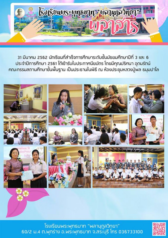 31 มีนาคม 2562 นักเรียนที่สำเร็จการศึกษา ประจำปีการศึกษา 2561 ได้เข้ารับใบประกาศนียบัตร โดยคุณปริศนา อุดมรัตน์ คณะกรรมการสถานศึกษาขั้นพื้นฐาน เป็นประธานในพิธี