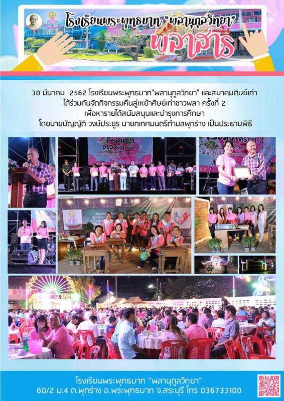 30 มีนาคม 2562 โรงเรียนพระพุทธบาท "พลานุกูลวิทยา" และสมาคมศิษย์เก่า ได้ร่วมกันจัดกิจกรรมคืนสู่เหย้าชาวพลาครั้งที่ 2
