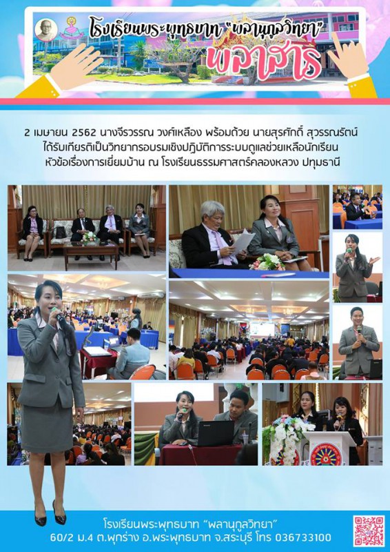 2 เมษายน 2562 นางจีรวรรณ วงศ์เหลือง พร้อมด้วยนายสุรศักดิ์ สุวรรณรัตน์ ได้รับเกียรติเป็นวิทยากรอมรมเชิงปฏิบัติการระบบดูแลช่วยเหลือนักเรียน หัวข้อ การเยี่ยมบ้าน ณ โรงเรียนธรรมศาสตร์คลองหลวงวิทยาคม