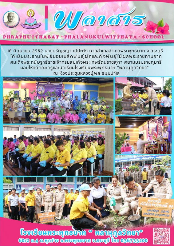 18 มิถุนายน 2562 นายปรัญชญา เปปะตัง นายอำเภออำเภอพระพุทธบาท จ.สระบุรี ได้เป็นประธานในพิธีมอบเมล็ดพันธุ์ผักและกิ่งพันธุ์ไม้ผลพระราชทานจากสมเด็จพระกนิษฐาธิราชเจ้ากรมสมเด็จพระเทพรัตนราชสุดา สยามบรมราชกุมารีมอบให้แก่คณะครูและนักเรียนโรงเรียนพระพุทธบาท “พลานุก