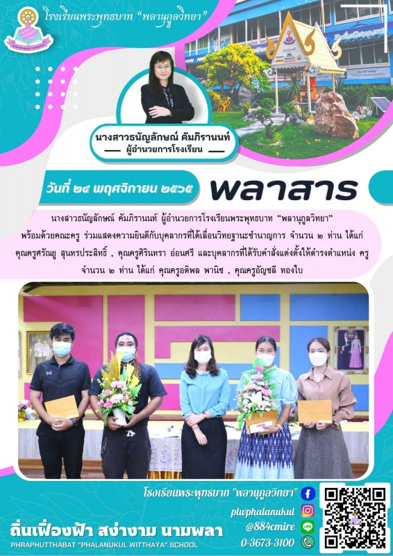 นางสาวธนัญลักษณ์ คัมภิรานนท์ ผู้อำนวยการโรงเรียนพระพุทธบาท “พลานุกูลวิทยา” พร้อมด้วยคณะครู ร่วมแสดงความยินดีกับบุคลากรที่ได้เลื่อนวิทยฐานะชำนาญการ จำนวน ๒ ท่าน และบุคลากรที่ได้รับคำสั่งแต่งตั้งให้ดำรงตำแหน่ง ครู จำนวน ๒ ท่าน