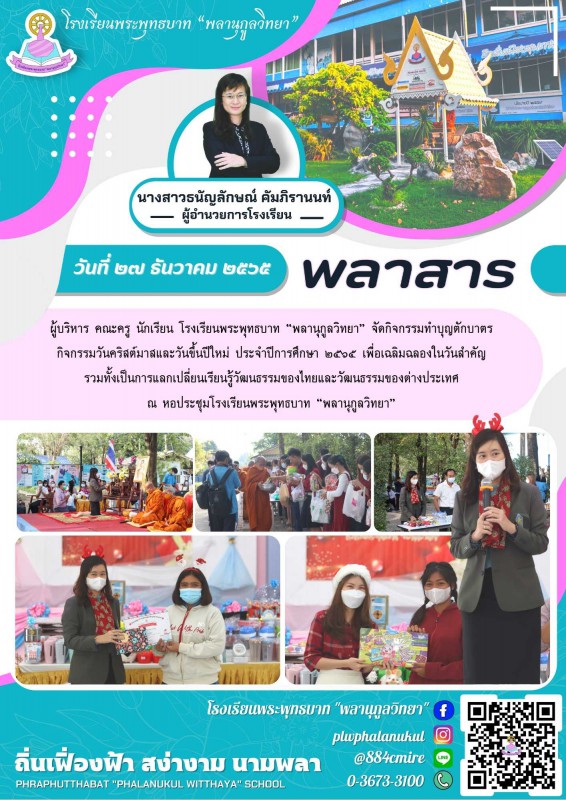 ผู้บริหาร คณะครู นักเรียน โรงเรียนพระพุทธบาท “พลานุกูลวิทยา” จัดกิจกรรมทำบุญตักบาตร กิจกรรมวันคริสต์มาสและวันขึ้นปีใหม่ ประจำปีการศึกษา ๒๕๖๕ เพื่อเฉลิมฉลองในวันสำคัญ รวมทั้งเป็นการแลกเปลี่ยนเรียนรู้วัฒนธรรมของไทยและวัฒนธรรมของต่างประเทศ ณ หอประชุมโรงเรียน