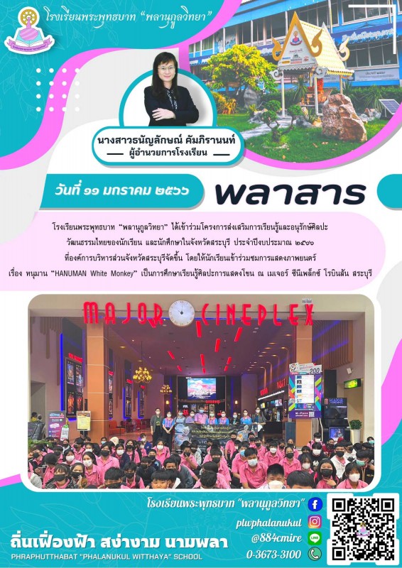 โรงเรียนพระพุทธบาท “พลานุกูลวิทยา” ได้เข้าร่วมโครงการส่งเสริมการเรียนรู้และอนุรักษ์ศิลปะ วัฒนธรรมไทยของนักเรียน และนักศึกษาในจังหวัดสระบุรี ประจำปีงบประมาณ ๒๕๖๖ ที่องค์การบริหารส่วนจังหวัดสระบุรีจัดขึ้น โดยให้นักเรียนเข้าร่วมชมการแสดงภาพยนตร์ เรื่อง หนุมา