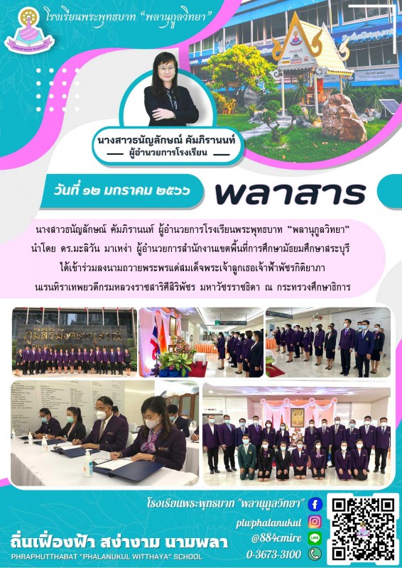 นางสาวธนัญลักษณ์ คัมภิรานนท์ ผู้อำนวยการโรงเรียนพระพุทธบาท “พลานุกูลวิทยา” นำโดย ดร.มะลิวัน มาเหง่า ผู้อำนวยการสำนักงานเขตพื้นที่การศึกษามัธยมศึกษาสระบุรี ได้เข้าร่วมลงนามถวายพระพรแด่สมเด็จพระเจ้าลูกเธอเจ้าฟ้าพัชรกิติยาภา นเรนทิราเทพยวดีกรมหลวงราชสาริศีส