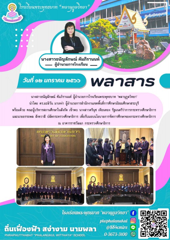 นางสาวธนัญลักษณ์ คัมภิรานนท์ ผู้อำนวยการโรงเรียนพระพุทธบาท "พลานุกูลวิทยา" นำโดย ดร.มะลิวัน มาเหง่า ผู้อำนวยการสำนักงานเขตพื้นที่การศึกษามัธยมศึกษาสระบุรี พร้อมด้วย คณะผู้บริหารสถานศึกษาในสังกัด เข้าพบ นางสาวตรีนุช เทียนทอง รัฐมนตรีว่าการกระทรวงศึกษาธิการ