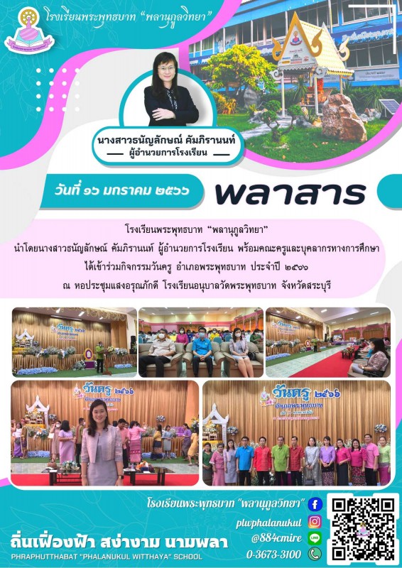 โรงเรียนพระพุทธบาท “พลานุกูลวิทยา” นำโดยนางสาวธนัญลักษณ์ คัมภิรานนท์ ผู้อำนวยการโรงเรียน พร้อมคณะครูและบุคลากรทางการศึกษา ได้เข้าร่วมกิจกรรมวันครู อำเภอพระพุทธบาท ประจำปี ๒๕๖๖ ณ หอประชุมแสงอรุณภักดี โรงเรียนอนุบาลวัดพระพุทธบาท จังหวัดสระบุรี