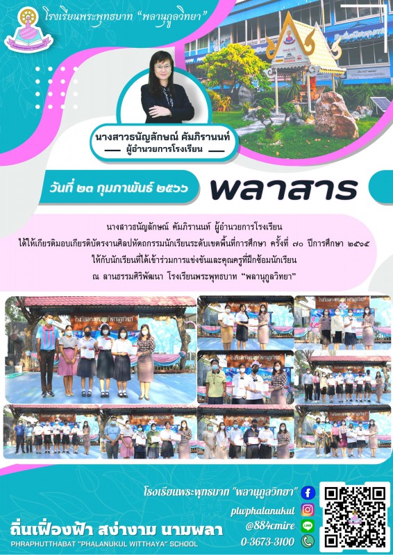 นางสาวธนัญลักษณ์ คัมภิรานนท์ ผู้อำนวยการโรงเรียน ได้ให้เกียรติมอบเกียรติบัตรงานศิลปหัตถกรรมนักเรียนระดับเขตพื้นที่การศึกษา ครั้งที่ ๗๐ ปีการศึกษา ๒๕๖๕ ให้กับนักเรียนที่ได้เข้าร่วมการแข่งขันและคุณครูที่ฝึกซ้อมนักเรียน ณ ลานธรรมศิริพัฒนา โรงเรียนพระพุทธบาท