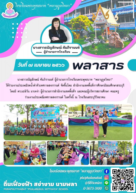 นางสาวธนัญลักษณ์ คัมภิรานนท์ ผู้อำนวยการโรงเรียนพระพุทธบาท “พลานุกูลวิทยา” ได้ร่วมงานประเพณีรดน้ำดำหัวเทศกาลสงกรานต์ จัดขึ้นโดย สำนักงานเขตพื้นที่การศึกษามัธยมศึกษาสระบุรี