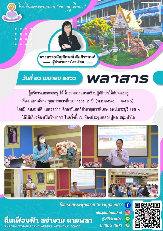 ผู้บริหารและคณะครู ได้เข้าร่วมการอบรมเชิงปฏิบัติการให้กับคณะครู เรื่อง แผนพัฒนาคุณภาพการศึกษา ระยะ ๕ ปี (พ.ศ.๒๕๖๖ - ๒๕๗๐)