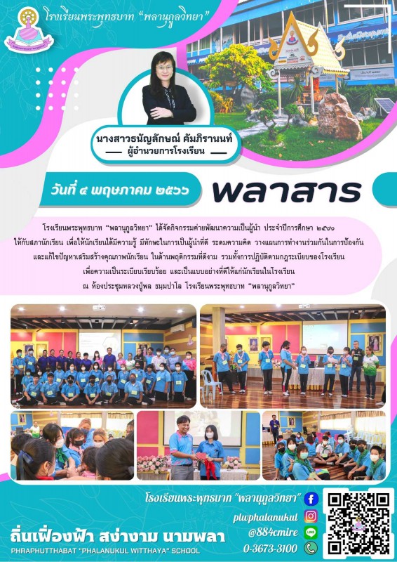 โรงเรียนพระพุทธบาท “พลานุกูลวิทยา” ได้จัดกิจกรรมค่ายพัฒนาความเป็นผู้นำ ประจำปีการศึกษา ๒๕๖๖ ให้กับสภานักเรียน เพื่อให้นักเรียนได้มีความรู้ มีทักษะในการเป็นผู้นำที่ดี ระดมความคิด วางแผนการทำงานร่วมกันในการป้องกัน และแก้ไขปัญหาเสริมสร้างคุณภาพนักเรียน ในด้า