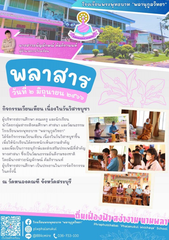 ผู้บริหารสถานศึกษา คณะครู และนักเรียน นำโดยกลุ่มสาระสังคมศึกษา ศาสนา และวัฒนธรรม โรงเรียนพระพุทธบาท “พลานุกูลวิทยา” ได้จัดกิจกรรมเวียนเทียน เนื่องในวันวิสาขบูชาขึ้น เพื่อให้นักเรียนได้ตระหนักเห็นความสำคัญ และเพื่อเป็นการอนุรักษ์และส่งเสริมประเพณีที่สำคัญ