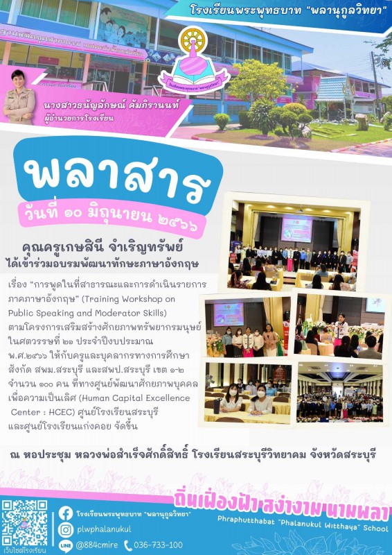 คุณครูเกษสินี จำเริญทรัพย์ ได้เข้าร่วมอบรมพัฒนาทักษะภาษาอังกฤษเรื่อง “การพูดในที่สาธารณะและการดำเนินรายการ ภาคภาษาอังกฤษ” (Training Workshop on Public Speaking and Moderator Skills) ตามโครงการเสริมสร้างศักยภาพทรัพยากรมนุษย์ ในศตวรรษที่ ๒๑ ประจำปีงบประมาณ