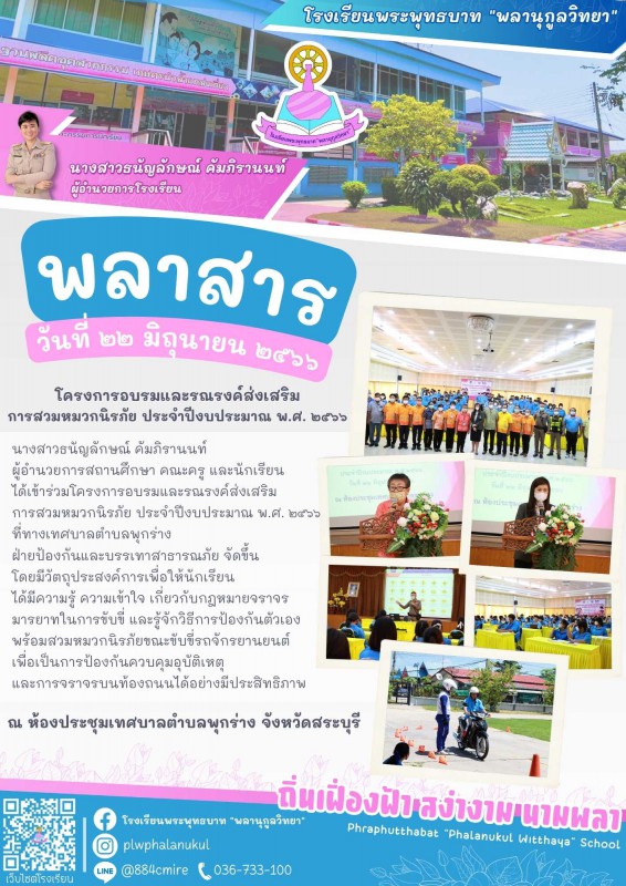 นางสาวธนัญลักษณ์ คัมภิรานนท์ ผู้อำนวยการสถานศึกษา คณะครู และนักเรียน ได้เข้าร่วมโครงการอบรมและรณรงค์ส่งเสริม การสวมหมวกนิรภัย ประจำปีงบประมาณ พ.ศ. ๒๕๖๖ ที่ทางเทศบาลตำบลพุกร่าง ฝ่ายป้องกันและบรรเทาสาธารณภัย จัดขึ้น โดยมีวัตถุประสงค์การเพื่อให้นักเรียน ได้