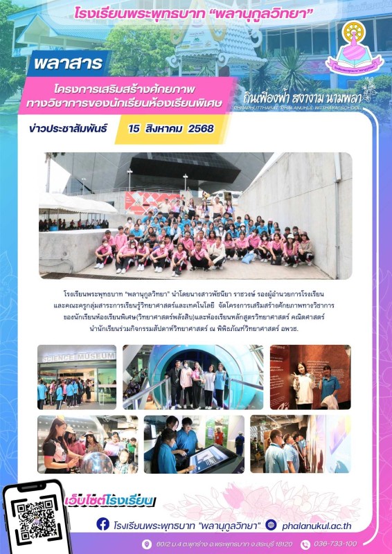 โรงเรียนพระพุทธบาท “พลานุกูลวิทยา” นำโดยนางสาวพัชนียา ราชวงษ์ รองผู้อำนวยการโรงเรียน และคณะครูกลุ่มสาระการเรียนรู้วิทยาศาสตร์และเทคโนโลยี จัดโครงการเสริมสร้างศักยภาพทางวิชาการ ของนักเรียนห้องเรียนพิเศษ(วิทยาศาสตร์พลังสิบ)และห้องเรียนหลักสูตรวิทยาศาสตร์ ค