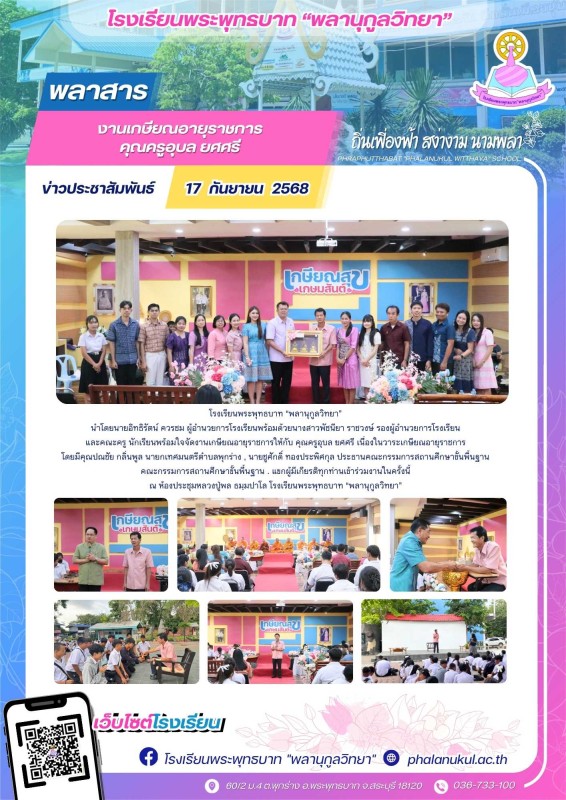 โรงเรียนพระพุทธบาท “พลานุกูลวิทยา” นำโดยนายอิทธิรัตน์ ควรชม ผู้อำนวยการโรงเรียนพร้อมด้วยนางสาวพัชนียา ราชวงษ์ รองผู้อำนวยการโรงเรียน และคณะครู นักเรียนพร้อมใจจัดงานเกษียณอายุราชการให้กับ คุณครูอุบล ยศศรี เนื่องในวาระเกษียณอายุราชการ โดยมีคุณปณชัย กลิ่นพูล