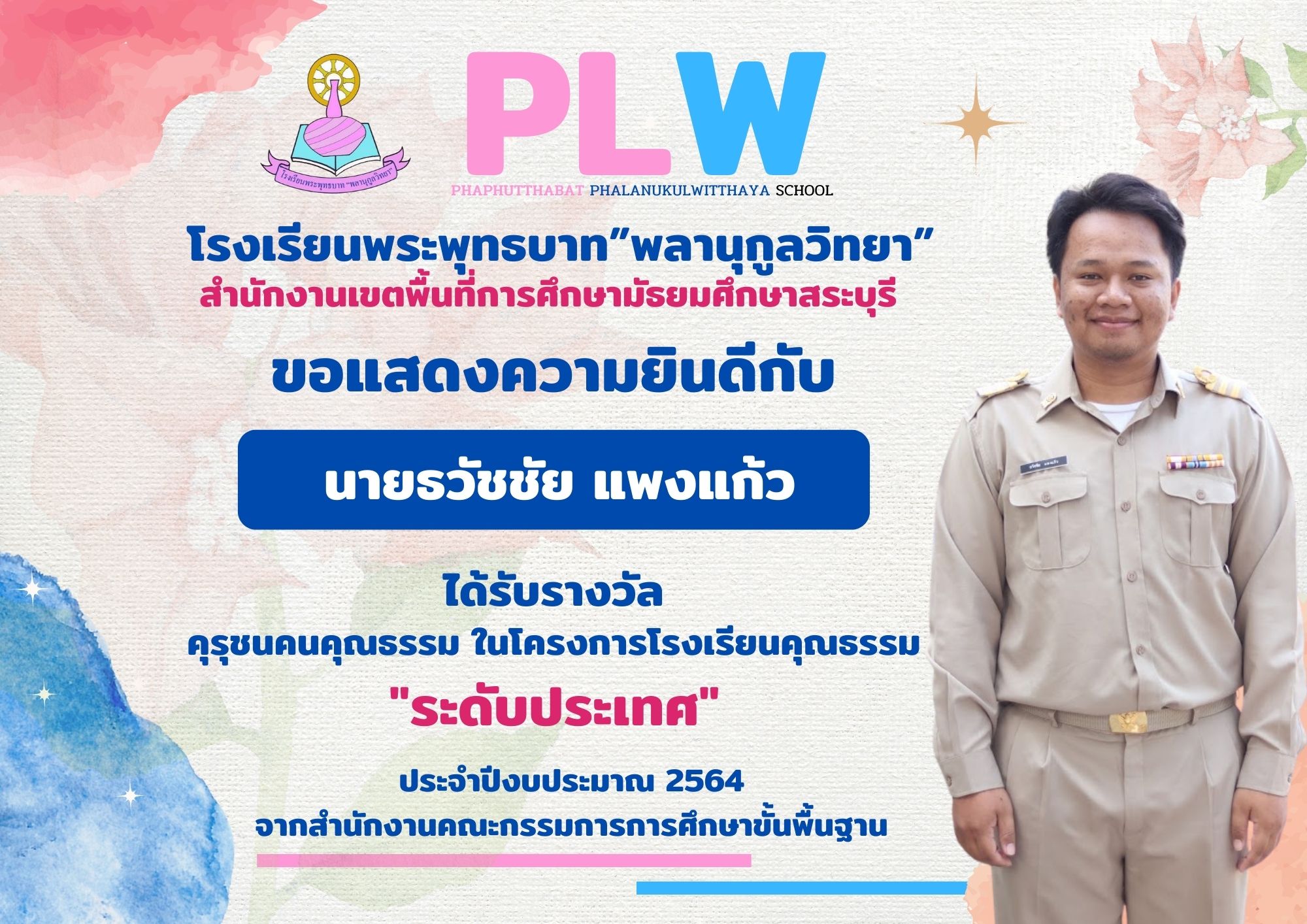 โรงเรียนพระพุทธบาท "พลานุกูลวิทยา" ขอแสดงความยินดีกับ คุณครูธวัชชัย แพงแก้ว ได้รับรางวัล คุรุชนคนคุณธรรม ในโครงการโรงเรียนคุณธรรม สพฐ. "ระดับประเทศ" ประจำปีงบประมาณ 2564 จากสำนักงานคณะกรรมการการศึกษาขั้นพื้นฐาน