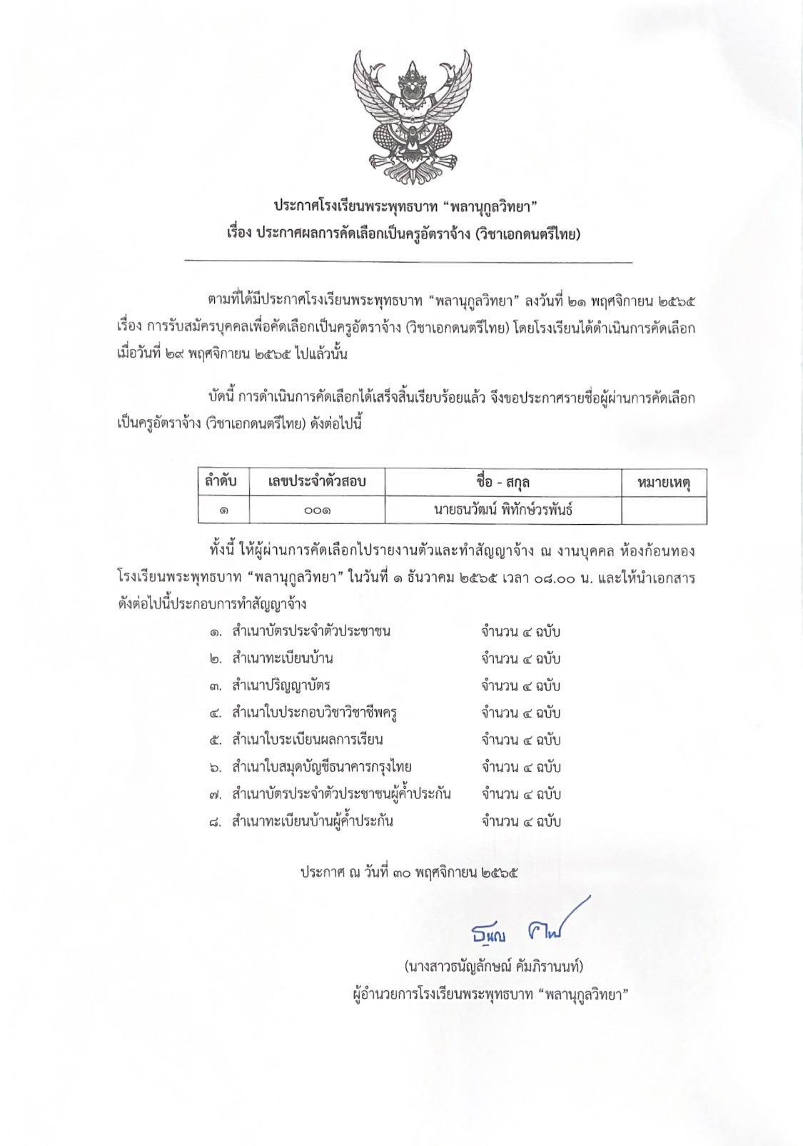 ประกาศโรงเรียนพระพุทธบาท "พลานุกูลวิทยา" เรื่อง ประกาศผลการคัดเลือกเป็นครูอัตราจ้าง (วิชาเอกดนตรีไทย)